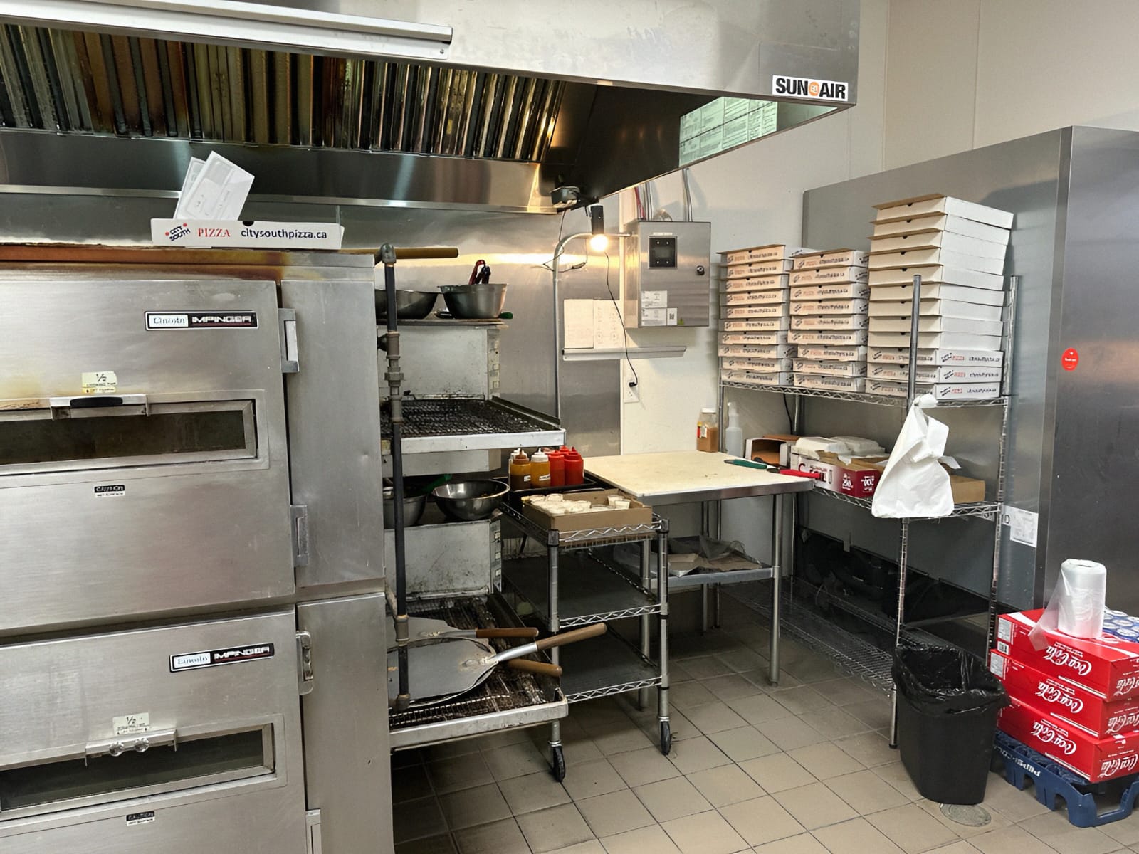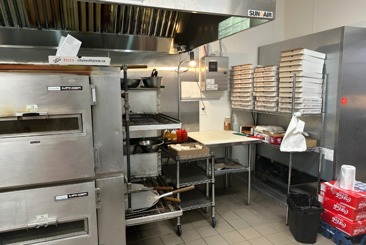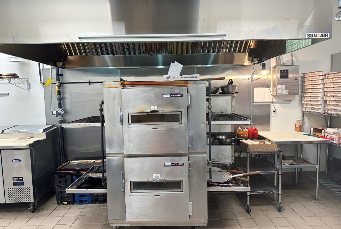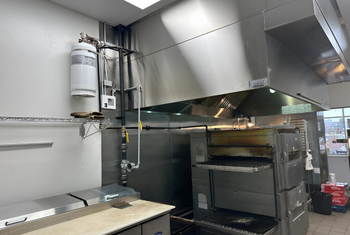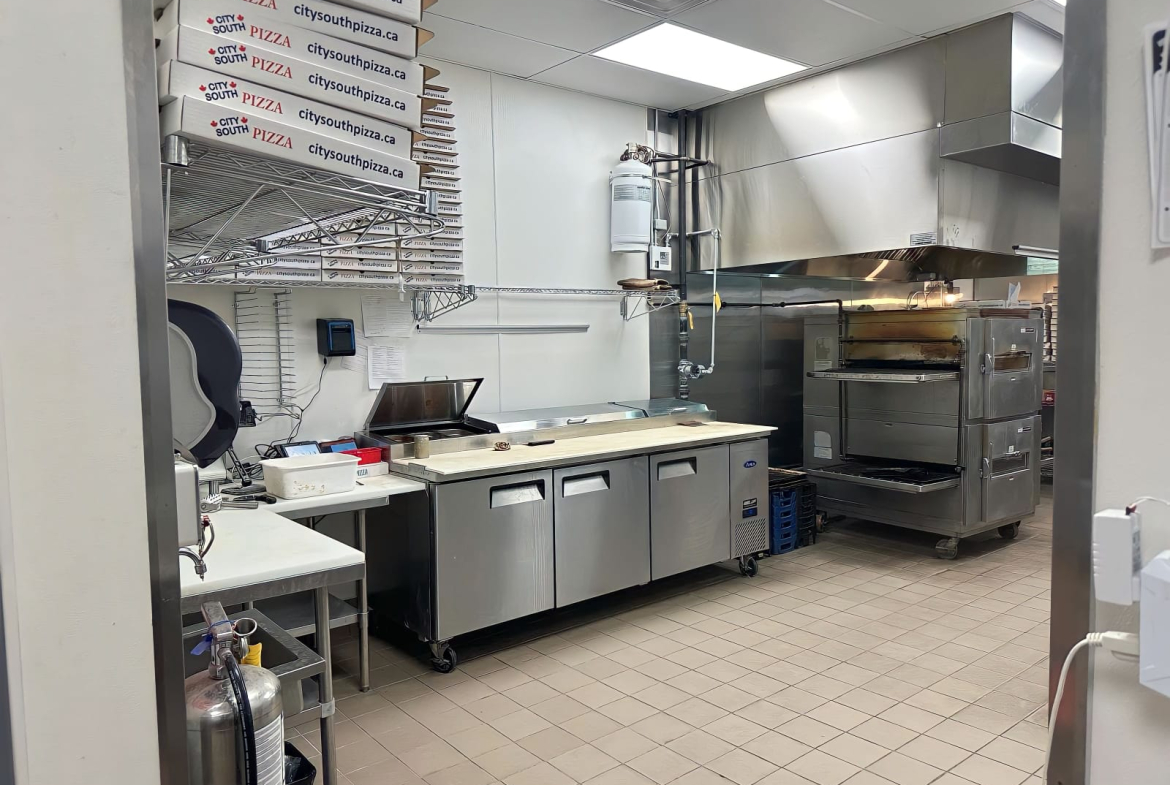 -Fully Equipped with a hood, conveyor pizza oven, walk-in cooler, and freezers