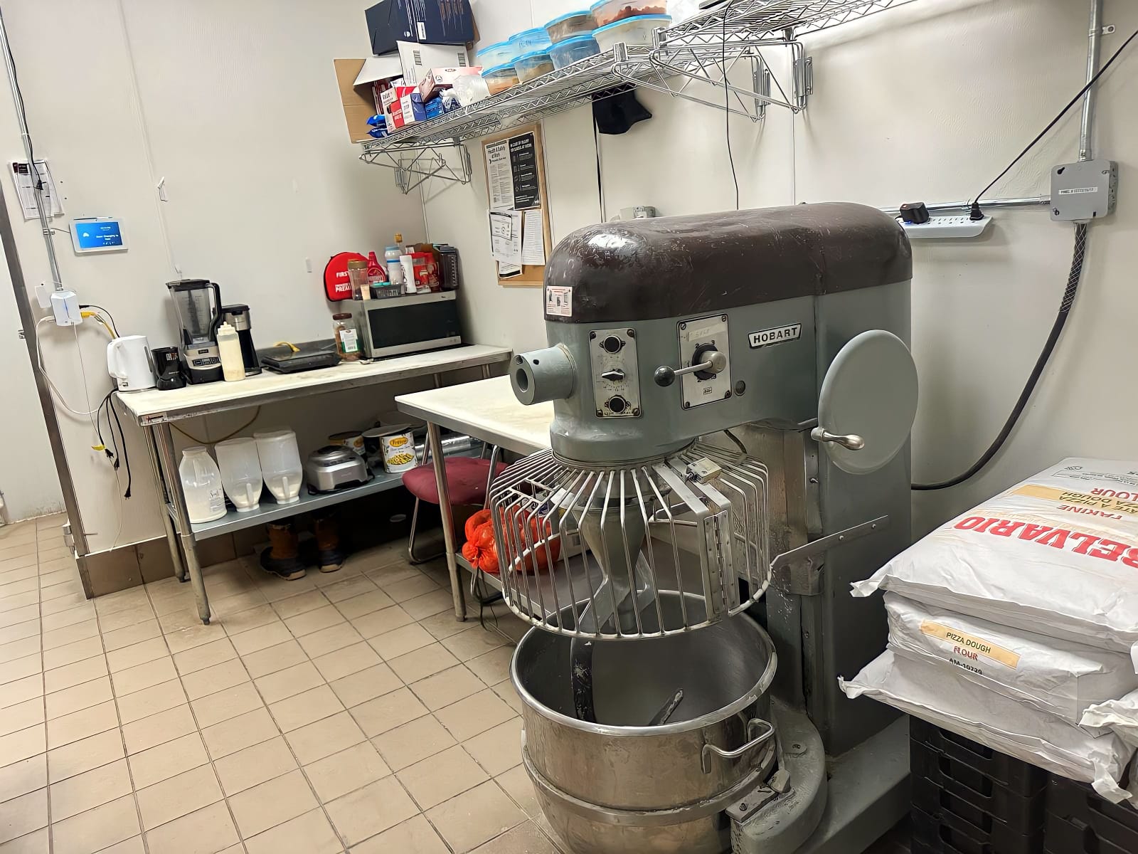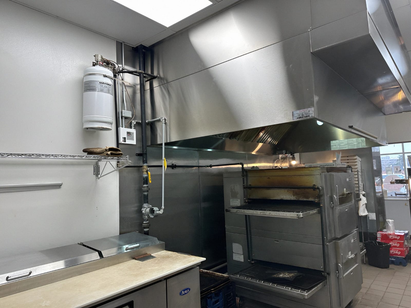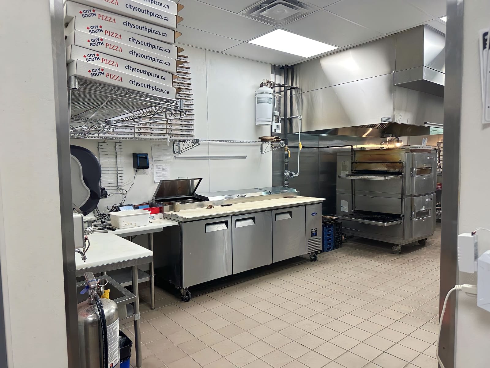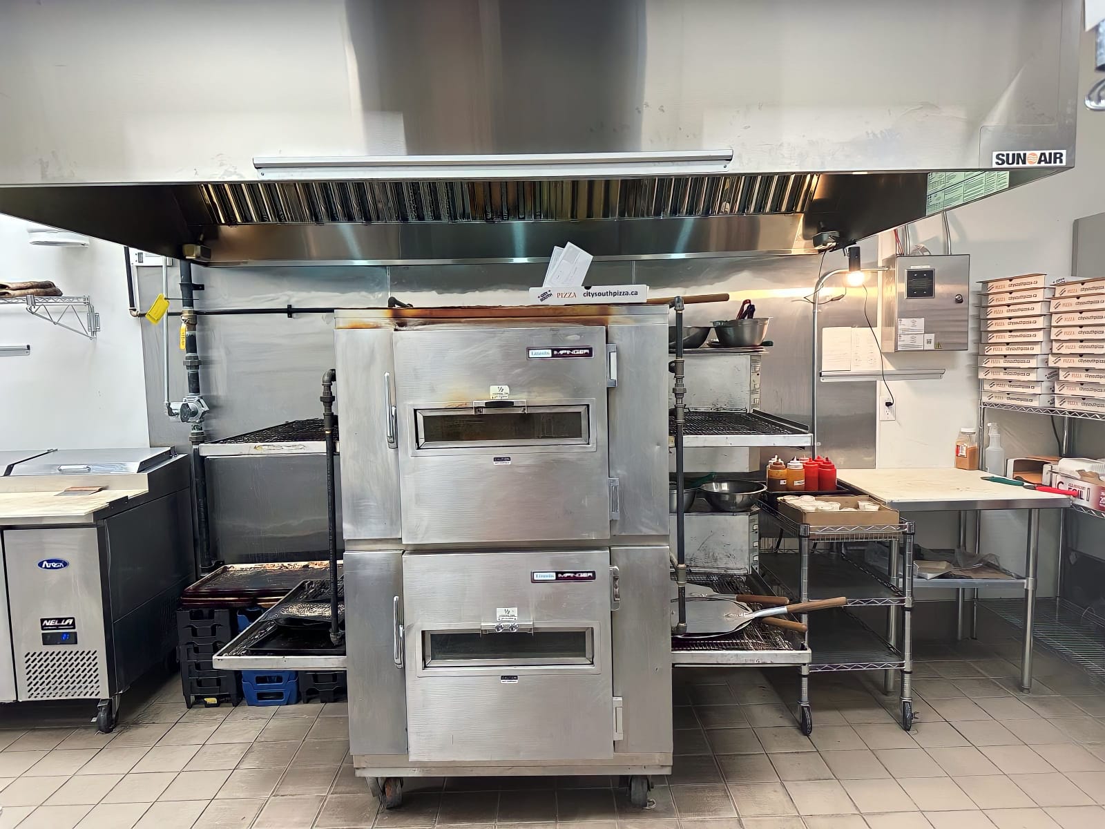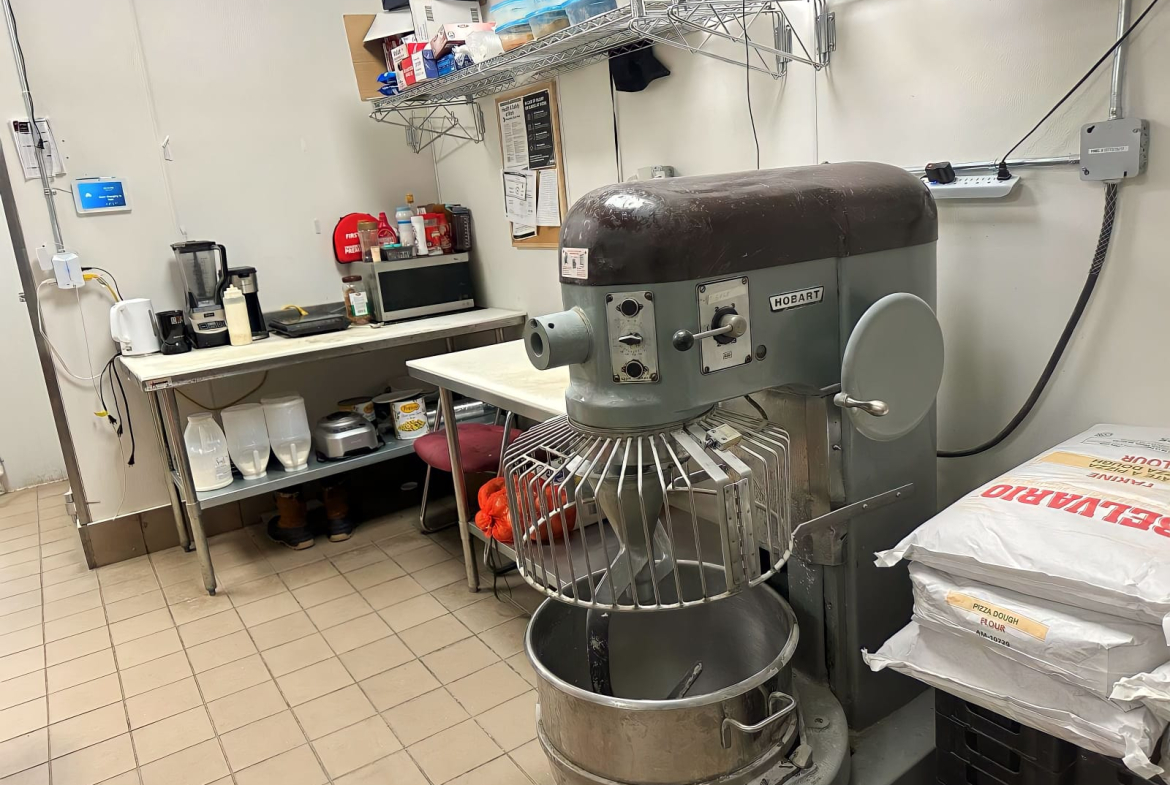 -Fully Equipped with a hood, conveyor pizza oven, walk-in cooler, and freezers